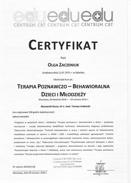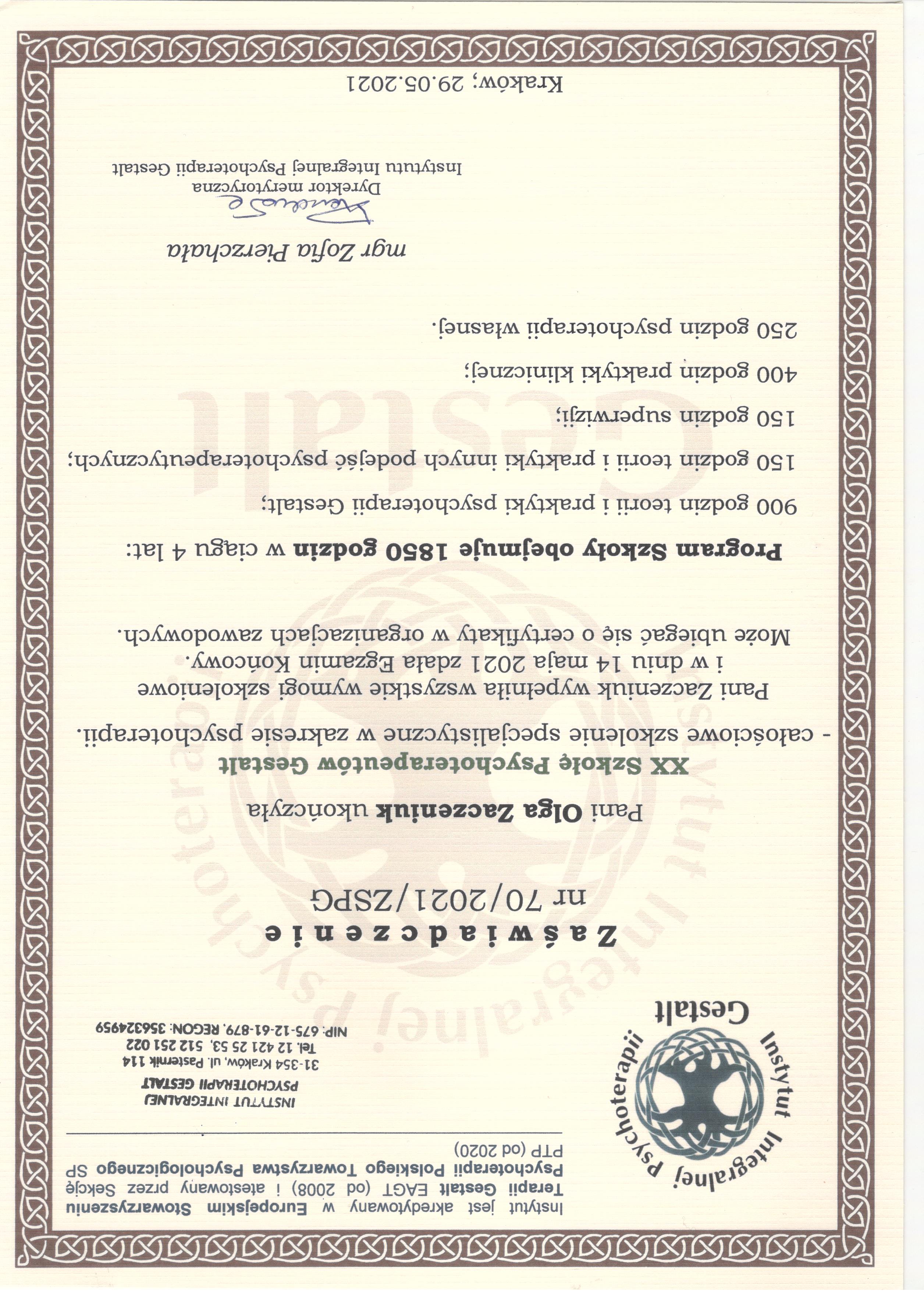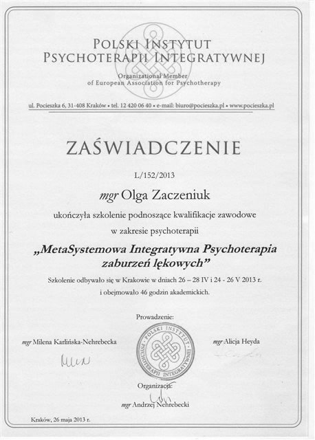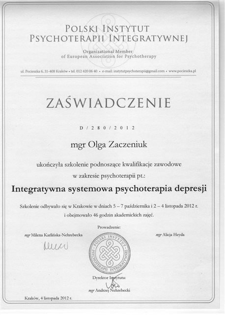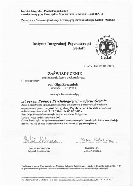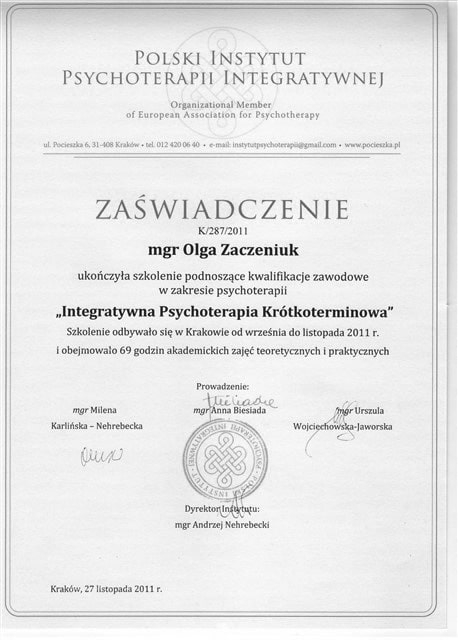 to regularne spotkania (sesje) odbywające się 1 raz w tygodniu. To szczególny rodzaj rozmowy klienta i psychoterapeuty, której treścią są ważne dla klienta sprawy. Mogą dotyczyć zmiany lub radzenia sobie z dokuczliwymi zachowaniami, przekonaniami, obsesjami, myślami lub emocjami, jak również rozwoju relacji i umiejętności społecznych. Dążeniem psychoterapii jest osiągnięcie przez klienta celów ustalonych wspólnie w trakcie konsultacji wstępnych.